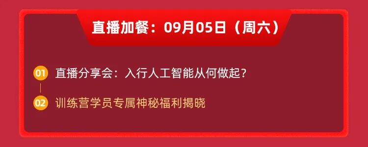 正式课程时间:08月29日 - 09月04日(7天)加餐课程时间:09月05日 下午 13:45-16:00结营仪式时间:09月07日 晚上 20:30-22:00