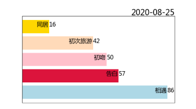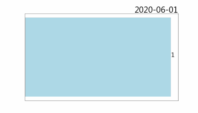 for y, (x,name) in enumerate(zip(days.values,item.values)): # 系列标注 ax.text (x, y, "%s" % x, size=12 ) if x > 1 : ax.text (x-0.5 , y, name, size=14 , ha = 'right') ax.text (1 , 1.01 , current_date, transform = ax.transAxes, size= 20 , ha='right') # 滚动时间 ax.get_xaxis().set_visible(False ) # 隐藏坐标轴 ax.get_yaxis().set_visible(False ) 接下来就是用 for 循环画出20张图并通过 plt.savefig('xxx.png') 一一保存,再使用 imageio 库或其他图像工具来合成 gif 啦! (不不不,慢着慢着)如果真要这样做就太麻烦了,下面该祭出这次的主角了! import matplotlib.animation as ani