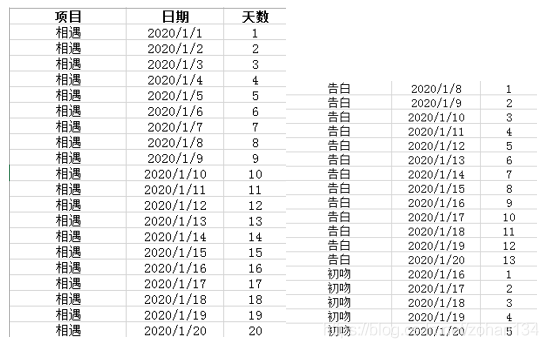 动态条形图 首先,不妨猜想一下这个是如何实现的。动画即是一帧一帧静态画面的连续播放,所以我们只需要将每一天都画一次图,再拼成 GIF 即可。 再来看一下用于画图的每日数据,假设2020年1月1日为起始日期,1月20日为当天(即发布供检阅的)日期,故要对这些数据画20次图(别怕,兄dei)。