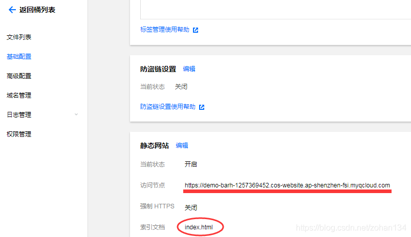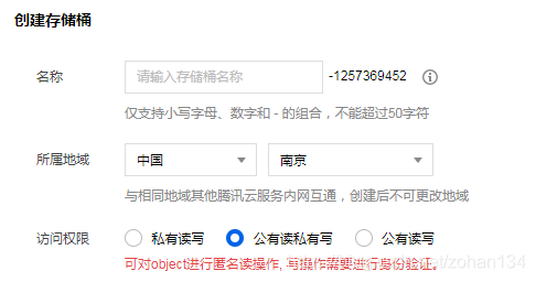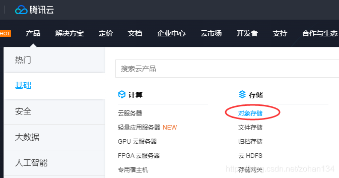 事情往往不像看上去那样简单,尽管我们已经历尽重重步骤,但依然遗留了两个坑:gif 图片在页面中加载慢(通过工具压缩图片大小来解决),部分浏览器不支持 window.onload (优化 js 脚本)。 本文不再多赘述,大家自己去探索吧(咔咔)!另外,可以加的东西还有词云、动态字符画、抽奖转盘等等,如果各位有什么其它有趣的玩意儿可以加进页面中,还请给笔者提供更多点子! 部署站点到企鹅云 最近发现 Github 有点抽风,之前部署的站点无法访问了!于是回家把站点迁到了企鹅云,果然国内服务器响应体验更佳,而且操作十分简便,让我们来看看怎么做吧。 首先进入企鹅云官网,在左上角的栏目中找到“对象储存”,进入页面后点击“立即使用”。 然后创建一个桶子,记得选“公有读私有写”,完全私有就不能通过外部访问啦。 返回桶子列表,在刚才创建的桶子右侧点击“配置管理”,开启静态网站后就可以通过访问节点的链接浏览站点了,是不是感觉比 Github page 快多了,哈哈。