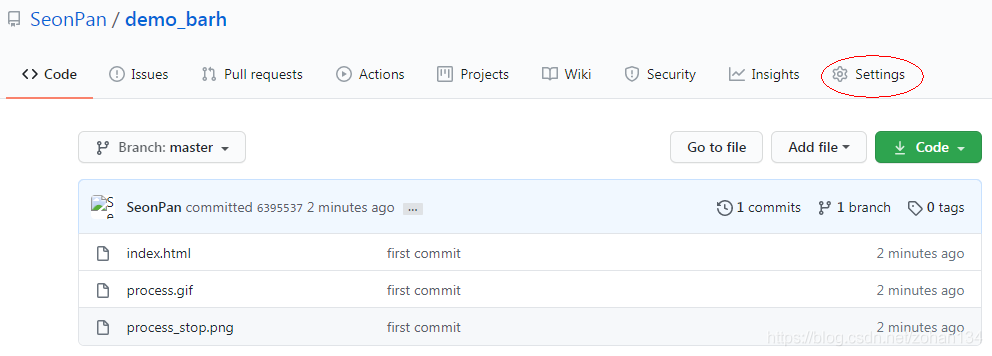 6、将本地仓库管理关联至 github(刚才得到的仓库地址): 最后一步上传时会相继弹出 Github 账号密码输入框,输入后即可等待上传完成。 完成后回到 Github,发现几个文件已经躺在仓库里了,再点击 Settings: 在 Gitub Pages 一栏中选择 master branch: 现在,你的站点可以通过这个链接来访问啦,把它丢进二维码里就大功告成了!可以用手机扫码看一下demo。