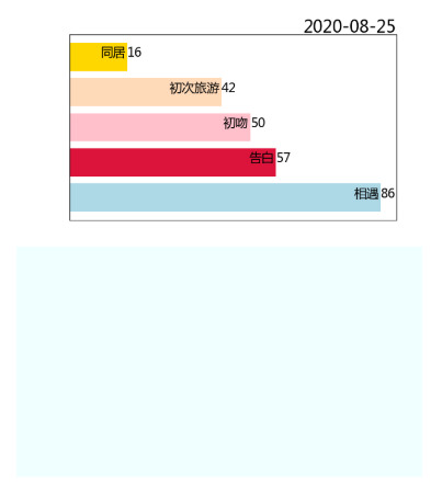 (嗯?就算你问上不了外网却能上 Github,我也…大概是限制的网段没覆盖到吧哈哈) 通过开头的最终(不是最终的)效果图可以发现,Gif 是首尾相接循环播放的,那最后一天的图像一下子闪过去就看不清楚了,可以修改一下传入的时间序列,把最后一幅图再画多几遍,就有停留的效果了。为了更好地展现效果,下面的图中所用数据的时间周期改为了从6月1日到8月25日(七夕),经过了86天,并增加了两条项目。 timeSlot = [x for x in range(0,86)]+[85]*15 直接放进 html 页面里,就单单一张图好像还缺了点什么,那就跟随动图的节奏在下方打印文字吧。首先设置两个 div 的样式,一个用于展示 gif,一个用于打印文字: <head > <style > .process_gif { /*显示动态barh*/ background-image :url ("./process.gif" ); background-repeat : no-repeat; background-size : cover; margin :0 auto;