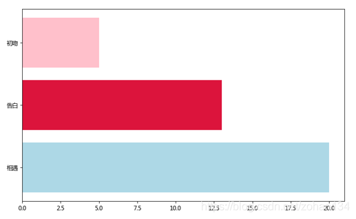 ] # 字体设为微软雅黑 colors = ['#ADD8E6' , '#DC143C' , '#FFC0CB' ] # 颜色列表 编写绘图函数:传入的参数是对于起始日期所经过的天数通过 t + datetime.timedelta(days=date) 计算需要绘制的指定天数的日期,再利用 strftime("%Y-%m-%d") 将其还原为日期文本,然后通过该日期文本取出当天的数据存入新的 df_ 中。下一步即为通过 barh 方法绘制条形图,且每次画新图前需清空上一次的图像。 def draw(date): # 数据处理 ------ current_date = (t + datetime.timedelta(days=date)).strftime("%Y-%m-%d" ) df_ = df[df['日期文本' ].eq(current_date) ] days = df_ ['天数' ] item = df_ ["项目" ] # 绘制条形图 ------ ax.clear() # 重绘 # for i in range(1,len(itme.uni)) ax.barh(item, days, color = colors) 如此之后,调用 draw(19) 来画出经过19天后,也就是第20天的图像,通过 plt.show() 临时查看一下。 和最终效果图还有一定的差距,多了坐标轴标签,少了系列标签、数据标注和右上角的滚动时间。继续完善 draw 函数:
