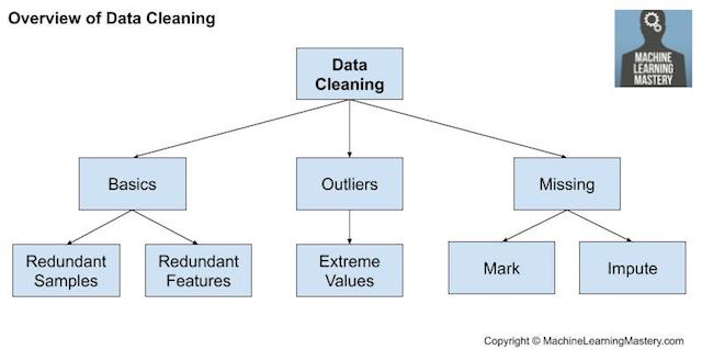 以上提供了一个粗略的框架,在使用结构化或表格数据的给定的项目中,我们可以利用这一框架来思考和引导不同的数据准备算法。数据清洗(https://machinelearningmastery.com/basic-data-cleaning-for-machine-learning/)包括修复“杂乱无章”的数据中的系统性问题或错误。最有用的数据清洗需要领域内的专业知识,涉及到识别和处理可能不正确的观察结果。有许多原因导致数据可能不正确,例如错误输入、损坏、重复等等。某一领域的专业知识可以帮助发现那些与预期的不同的明显错误,比如一个人身高200英尺。一旦发现杂乱、有噪声、损坏或错误的观测结果,就可以加以解决。这可能涉及删除行或列,或者用新值替换观测值。使用统计数据定义正常数据并识别异常值。