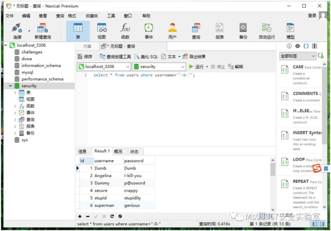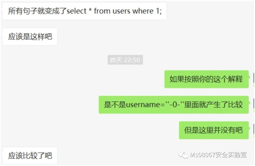 4、 MySQL 中的暗黑语法一定要去了解,说不定就是一个万能密码。例如这次的Poc 就是利用 MySQL 的弱类型,从而使得查询条件最终变成 username=0