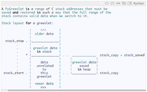 每一个greenlet其实就是一个函数,以及保存这个函数执行时的上下文.对于函数来说上下文也就是其stack..同一个进程的所有的greenlets共用一个共同的操作系统分配的用户栈.所以同一时刻只能有栈数据不冲突的greenlet使用这个全局的栈.greenlet是通过stack_stop,stack_start来保存其stack的栈底和栈顶的,如果出现将要执行的greenlet的stack_stop和目前栈中的greenlet重叠的情况,就要把这些重叠的greenlet的栈中数据临时保存到heap中.保存的位置通过stack_copy和stack_saved来记录,以便恢复的时候从heap中拷贝回栈中stack_stop和stack_start的位置.不然就会出现其栈数据会被破坏的情况.所以应用程序创建的这些greenlet就是通过不断的拷贝数据到heap中或者从heap中拷贝到栈中来实现并发的.对于io型的应用程序使用coroutine真的非常舒服.