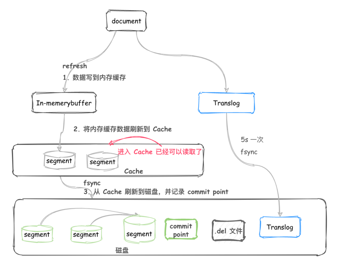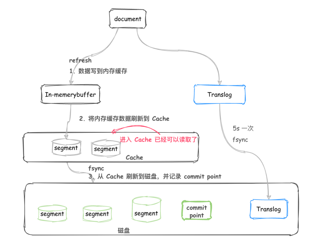 将文件刷新到磁盘是非常耗费资源的,而且在内存缓冲区和磁盘中间存在一个高速缓存(cache),一旦文件进入到 cache 就可以像磁盘上的 segment 一样被读取了。