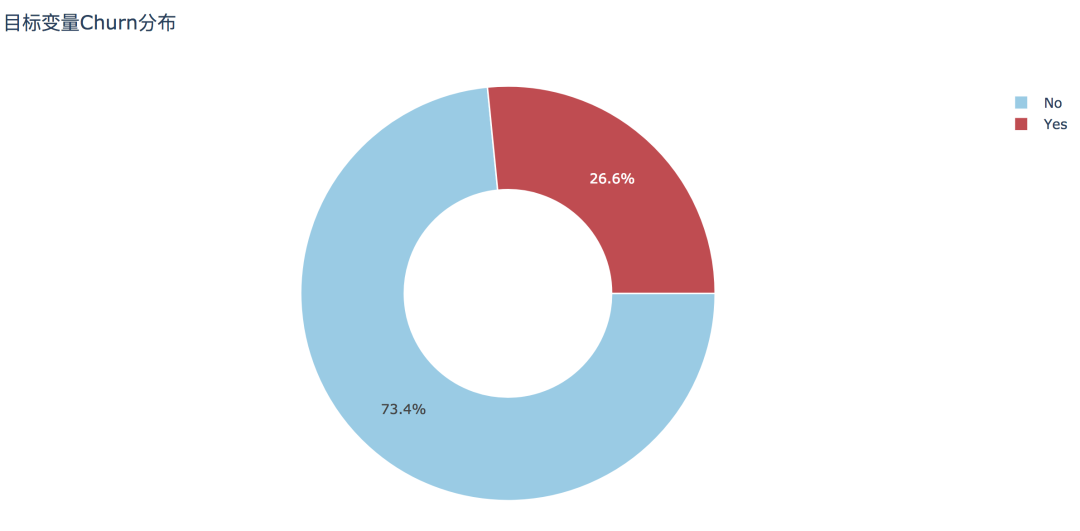 经过初步清洗之后的数据集大小为7032条记录,其中流失客户为1869条,占比26.6%,未流失客户占比73.4%。