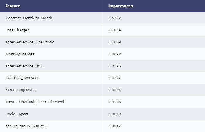 'OnlineSecurity', 'TechSupport', 'tenure_group', 'PaperlessBilling', 'InternetService', 'PaymentMethod', 'SeniorCitizen', 'MonthlyCharges', 'Dependents', 'Partner', 'Contract', 'StreamingTV', 'TotalCharges', 'StreamingMovies', 'OnlineBackup']