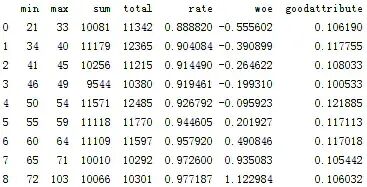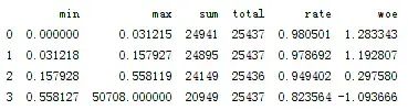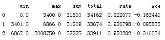 d3['woe']=np.log((d3['rate']/(1-d3['rate']))/(good/bad))