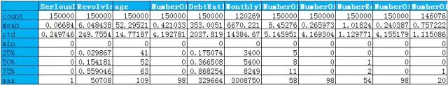 数据来自Kaggle的Give Me Some Credit,有15万条的样本数据,下图可以看到这份数据的大致情况。