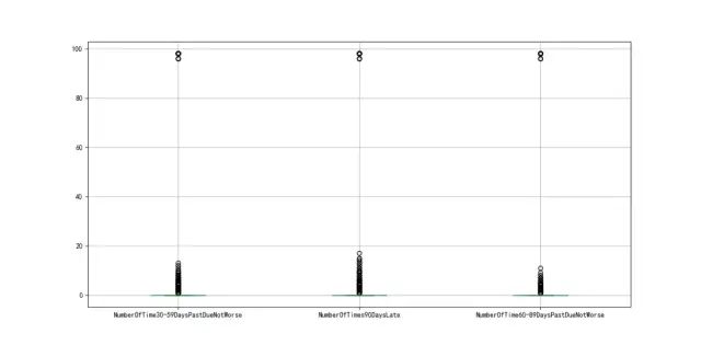 对于变量NumberOfTime30-59DaysPastDueNotWorse、NumberOfTimes90DaysLate、NumberOfTime60-89DaysPastDueNotWorse这三个变量,由下面的箱线图图3-2可以看出,均存在异常值,且由unique函数可以得知均存在96、98两个异常值,因此予以剔除。同时会发现剔除其中一个变量的96、98值,其他变量的96、98两个值也会相应被剔除。