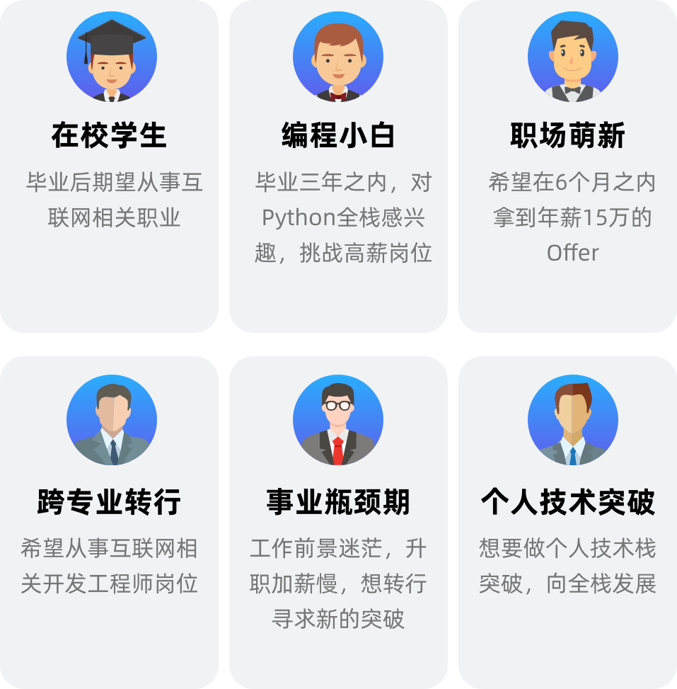 课程包含预修课和真实企业项目两大课程,帮助各位学员掌握必备知识技能,快速成长为Python全栈开发工程师,实现高薪职业!