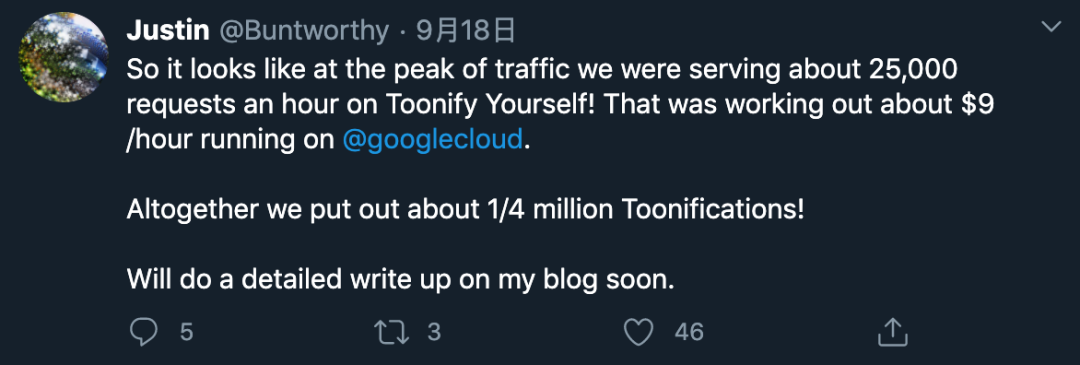 Justin Pinkney 发推表示,该网站一小时即服务了 25000 次请求,每小时的云服务成本达到 9 美元。在上线的短短时间内,该网站完成了 25 万次服务。