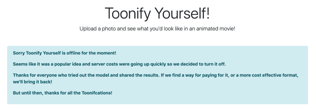 然而,Toonify Yourself! 网站上线仅一天,就因使用者多、服务器成本过高而暂时下线。