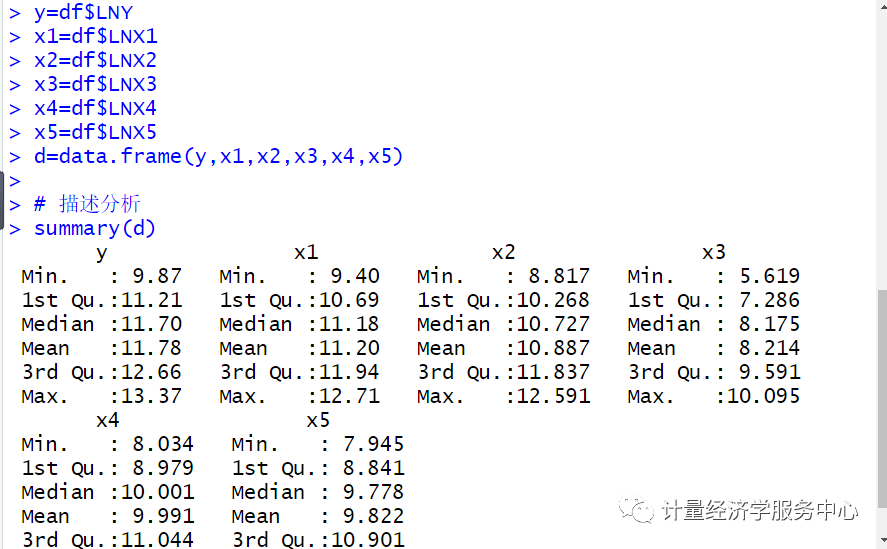 cor1=cor(data[,c('LNY','LNX1','LNX2','LNX3','LNX4','LNX5')])cor1