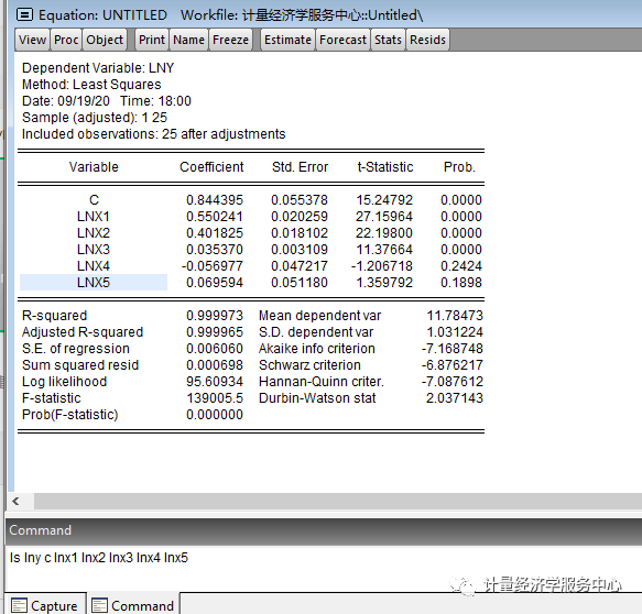 本文以Eviews软件为例,对计量经济学服务中心线上课程中回归分析章节我国1990至2014年相关数据进行回归分析,首先导入相关数据。总结:Eviews进行相关分析,可以使用cor lny lnx1 lnx2 lnx3进行分析然后进行回归分析,可以使用ls lny c lnx1 lnx2 lnx3 lnx4 lnx5进行分析