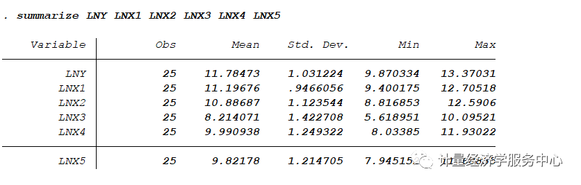 # 相关分析 cd C:\Users\admin\Desktop import excel 相关分析.xlsx, firstrow clear corr LNY LNX1 LNX2 LNX3 LNX4 LNX5 estpost summarize LNY LNX1 LNX2 LNX3 LNX4 LNX5, detail esttab using 计量经济学服务中心.rtf, cells("count mean(fmt(3)) p50 sd(fmt(2)) min max") noobs append