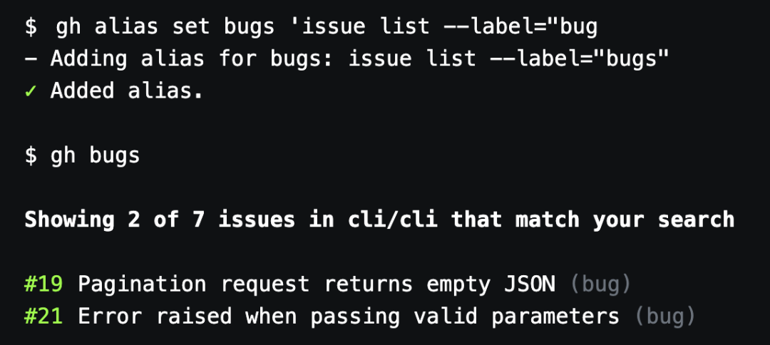 现在只需将这个命令重命名为bugs,那么今后只要输入gh bugs就能快速看到此类问题,大大提高了维护代码的效率。