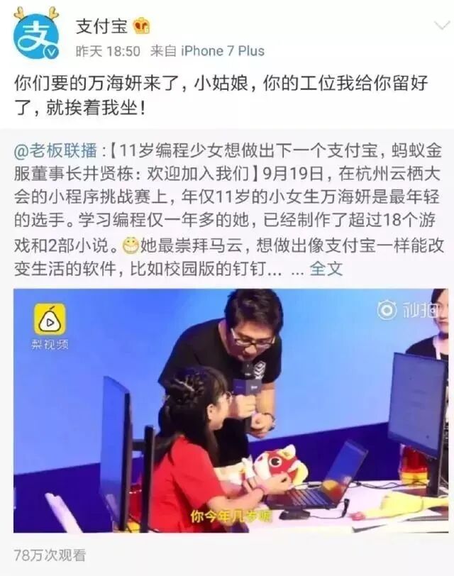 ·11岁的海妍,在支付宝8分钟小程序挑战赛上,她出色表现赢得了支付宝CEO的青睐,CEO当场表示:“欢迎你今后加入支付宝。”
