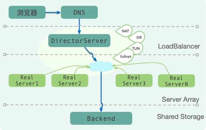 如下图,LVS 架设的服务器集群系统有三个部分组成: