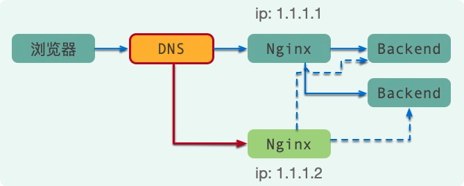 第一种方式当然是要在 DNS 上做文章了。通过在 DNS 上,绑定多个 Nginx 的 IP 地址,即可完成高可用。不仅能够完成高可用,还能顺便完成负载均衡。