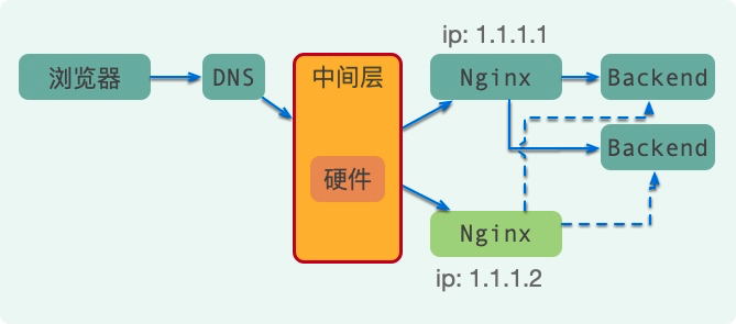 只有所有的缓存都不命中的情况下,DNS 才会查询真正的 IP 地址。所以,如果有一台 Nginx 宕机了,这个故障的感知能力就会特别的差。总有一部分用户的请求,会落在这台已经死亡的机器上。