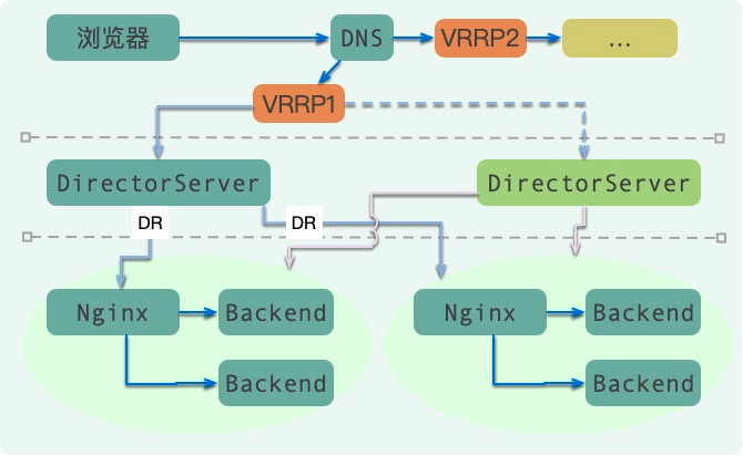 如图,DNS 可以将请求绑定在 VIP 上。由于 LVS DR 模式的效率非常高,网卡要达到瓶颈也需要非常大的请求量(只有入口流量才走 LVS),所以一般通过 LVS 做 Nginx 的负载均衡就足够了。