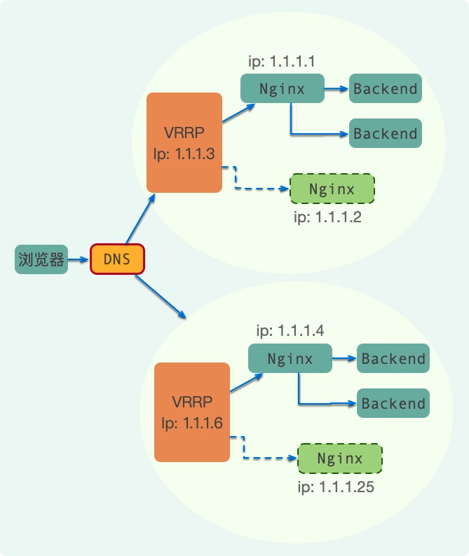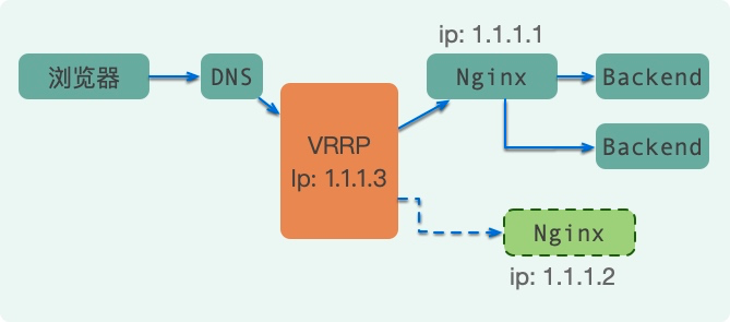 我们把 DNS 的地址绑定在 VIP 上,当正在服务的 Nginx 发生问题,VIP 会发生漂移,转移到另外一台 Nginx 上。