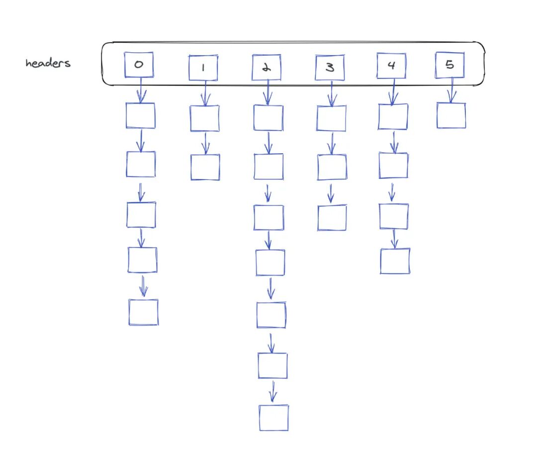 headers是一个定长的数组,数组当中的每一个元素都是一个链表的头结点。也就是说根据这个头结点,我们可以遍历这个链表。数组是定长的,但是链表是变长的 ,所以如果我们发生元素的增删改查,本质上都是通过链表来实现的。