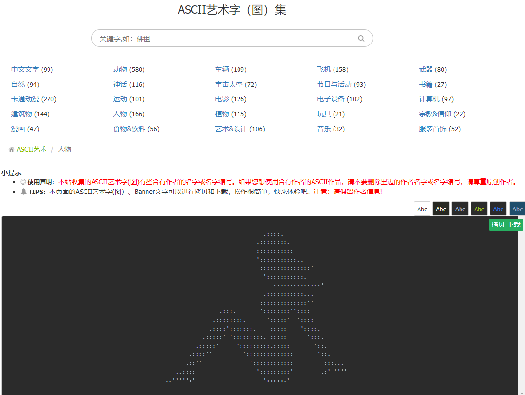 bootschool不仅可以生成在线图集,还搜集了很多有趣的字符画,我们可以通过它的ascii艺术字图页签获取,比如我选择人物: