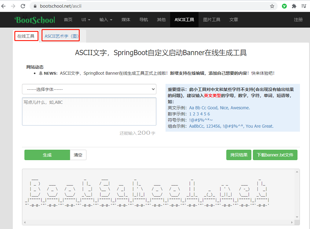 ASCII艺术字(图)集:https://www.bootschool.net/ascii-art