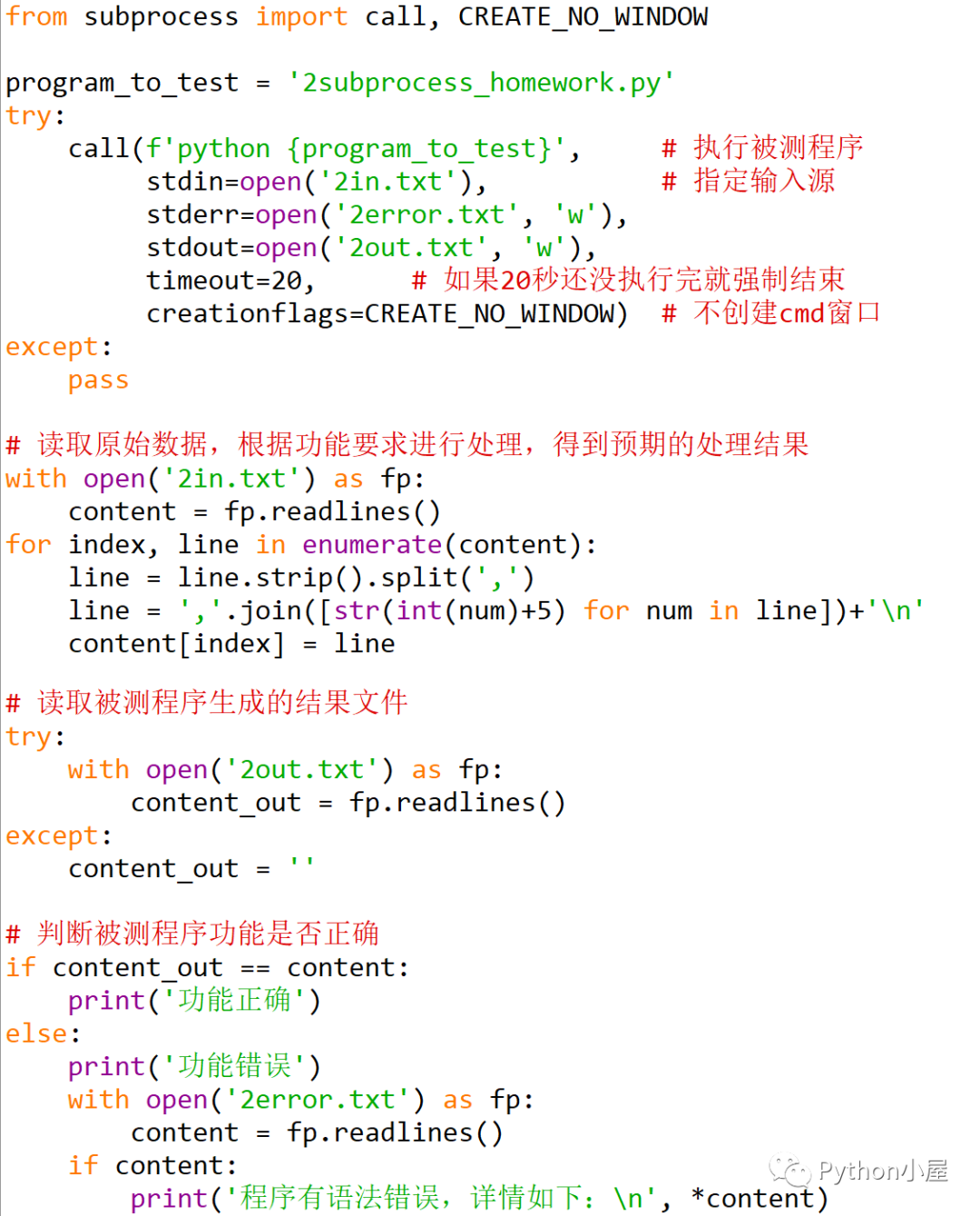 编写程序2subprocess_test.py测试另一个Python程序2subprocess_homework.py的功能是否正确(不考虑具体的代码实现方式)。程序2subprocess_homework.py预设的功能为“键盘输入若干行使用英文半角逗号分隔的自然数,把该行每个自然数加5后按原来的格式输出(每行若干自然数,使用英文半角逗号分隔),如果没有输入任何内容就直接回车确认表示输入结束”。为了实现自动测试,程序2subprocess_test.py调用程序2subprocess_homework.py,并使其自动从文件2in.txt中读取内容作为测试用例,并把处理后的结果自动写入文件2out.txt中。如果文件2out.txt中的内容和预期一样,则表示程序2subprocess_homework.py的功能正确。为避免被测程序2subprocess_homework.py中有死循环,如果20秒内没有执行完,直接结束被测程序的执行,并判断功能错误。