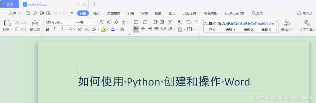 # 导入库 from docx import Document from docx.shared import Pt from docx.shared import Inches from docx.oxml.ns import qn# 新建空白文档 doc1 = Document()# 新增文档标题 doc1.add_heading('如何使用 Python 创建和操作 Word' ,0)# 保存文件 doc1.save('word1.docx' )这样就完成了创建文档和文章标题的操作,下面运行程序,会生成名为 word1.docx 的文档,打开文章显示如下图所示: