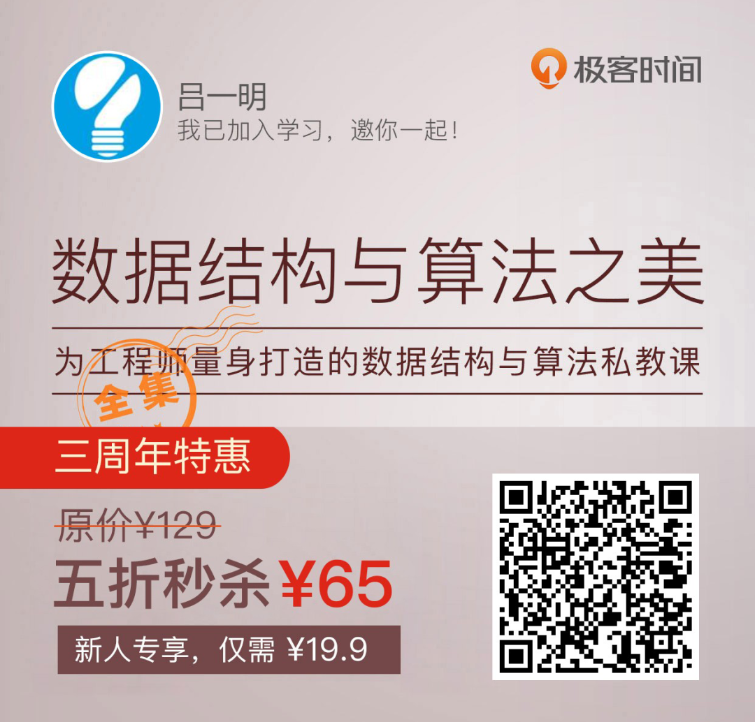 过了十一假期,下一个小长假就是元旦了,中间这仨月还是要老老实实上班的,毕竟快到年底了,为了年终奖也要好好表现一下自己。除了干好份内工作,为了不让后浪拍在沙滩上,我建议你闲暇的时候也要充充电,没准儿学到的新东西就在项目里用上了。趁着最近不太忙,给大家简单总结一下我平时的几个学习方法:1、保持坚持和良好的心态,搞清楚学习是为了提升自己,看书的时候不至于苦大仇深;2、把握学习节奏,每天完整空出0.5-1个小时专心学习,同时利用好通勤的碎片化时间来看书;3、带着目的去看书、看文档,看书前先想好需要这本书解决哪几个问题;4、把自己每个时间段要做的事情,做成表格,方便直观看出每天是怎么过的;5、注重知识的扩展,形成自己的学习体系,并定期整理和复习笔记内容。当然了,方法再多,也要看行动,如果你平时不习惯看官方文档,那么跟着圈里的一些大牛学习,肯定是最好的选择。我之前也给大家推荐过一些我觉得不错的学习资料,很多都来源于「极客时间」。不少读者在我的推荐下买了课,都在后台留言说很值,比如学了前 Google 王争的《数据结构与算法之美》,拿下了大厂的 Offer(9W 人在学,可以说全网最爆的算法课了);还有人学了丁奇的《MySQL实战45讲》通透了数据库,学了左耳朵耗子的《左耳听风》,收获了技术大佬 20 年的心法。转眼,极客时间发布都 3 周年了,作为老朋友,这次我和极客时间给大家送一波大福利:全场 68 元及以上课程,全部 5 折,最高立减¥149。可以说是我分享了这么久,最高的力度了。推荐几个我觉得内容不错,且适合大家的课程,入手绝对不亏。