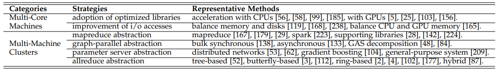 为此,我们根据目标场景将每个上述分类中的方法进行更精细的划分。我们分析了它们加速机器学习过程的动机和内在方法,并且据此对它们进行分门别类的介绍。在介绍中我们会结合它们各自领域中的代表性成果和特点进行深入的介绍。此外,我们还回顾了这些方法的混合方法即结合各个部分的优势,协同地对系统计算性能进行优化研究。
