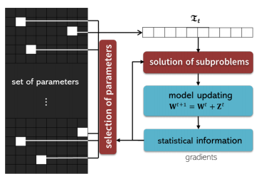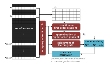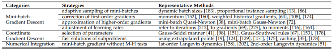 第三,对于处理具有大量实例的大型模型,我们自然而然地想到将MGD和CGD联合在一起,即在每次迭代中用几个实例更新参数子集。例如,最近学术界提出了一种叫做“小批量随机块坐标下降(mini-batch randomized block coordinate descent)”的方法:每次迭代中都基于随机小批量数据来估计所选参数的部分梯度。最后,小批量梯度MCMC算法提高了样本的质量,加快了贝叶斯推理的执行速度。