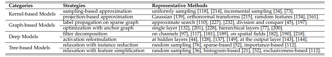 在前文中,我们从计算复杂性的角度回顾了各种大规模机器学习方法。现在我们来讨论上述方法的优缺点。首先,相对于深度模型来说,基于核技术和基于图的相关模型拥有更好的扩展性和可优化性。此外,利用基于核以及基于图相关的模型时,人类专家能够将自己的先验知识和领域经验量化进去,融入模型,省得从零开始进行复杂的模型训练。在数学中,半正定矩阵的和仍然是半正定矩阵,因此,当我们将不同类型特征的相似性合并到一个模型中的时候,这种方法将会十分容易和便利。值得我们注意的是,尽管基于图的方法相对于基于核的方法所需的内存开销更少,但是它们只能处理满足聚类假设(Cluster Assumption)的数据场景,如果数据不满足该假设,图方法也就束手无策了。