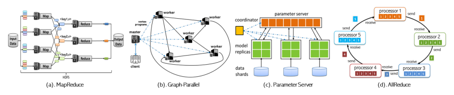 图4. 分布式处理系统示意图. (a) 是mapreduce系统的结构图,(b)是图并行系统的结构图,(c)是基于参数服务器的集群示意图,(d)是基于环的allreduce抽象的数据通信流程。