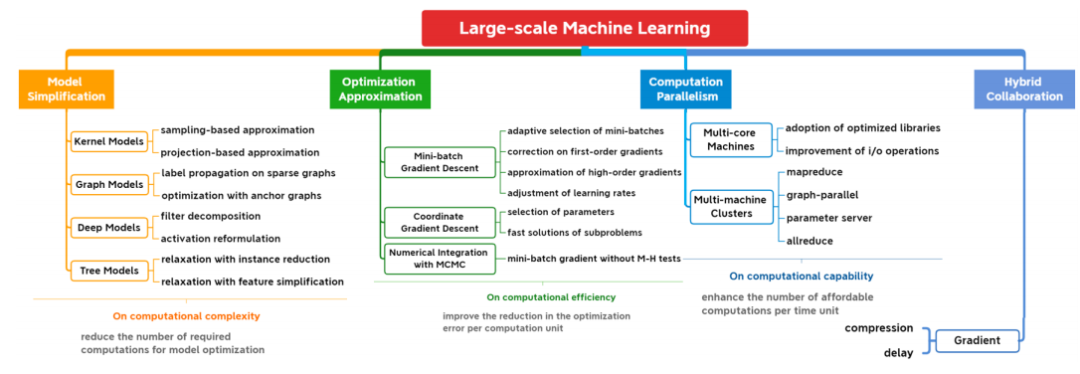 图1. 介绍结构图,我们从三个方面展示了将普通机器学习扩展到大规模机器学习的方法。