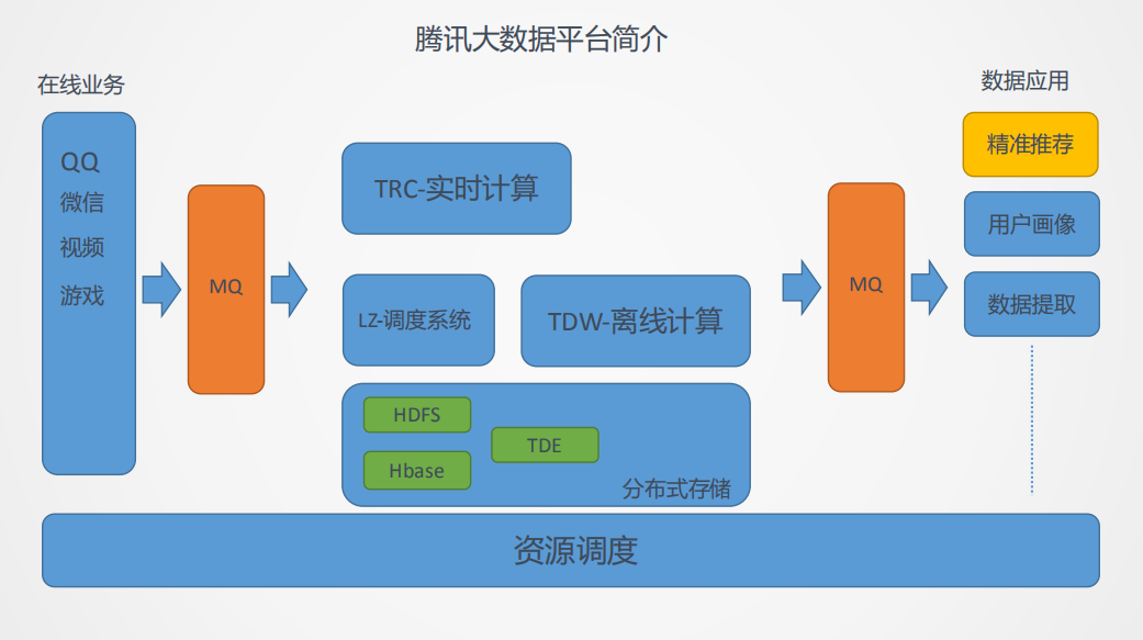 腾讯大数据示意图,如图8所示,在线业务的数据如微信游戏等会通过消息中间件实时地传递到中台系统,中台系统包括实时计算、离线计算、调度系统和分布式存储,这些数据有的会进行实时计算有的会进行离线计算,数据的应用也是从消息中间件中获取其需要的数据。