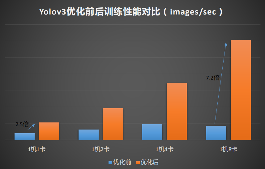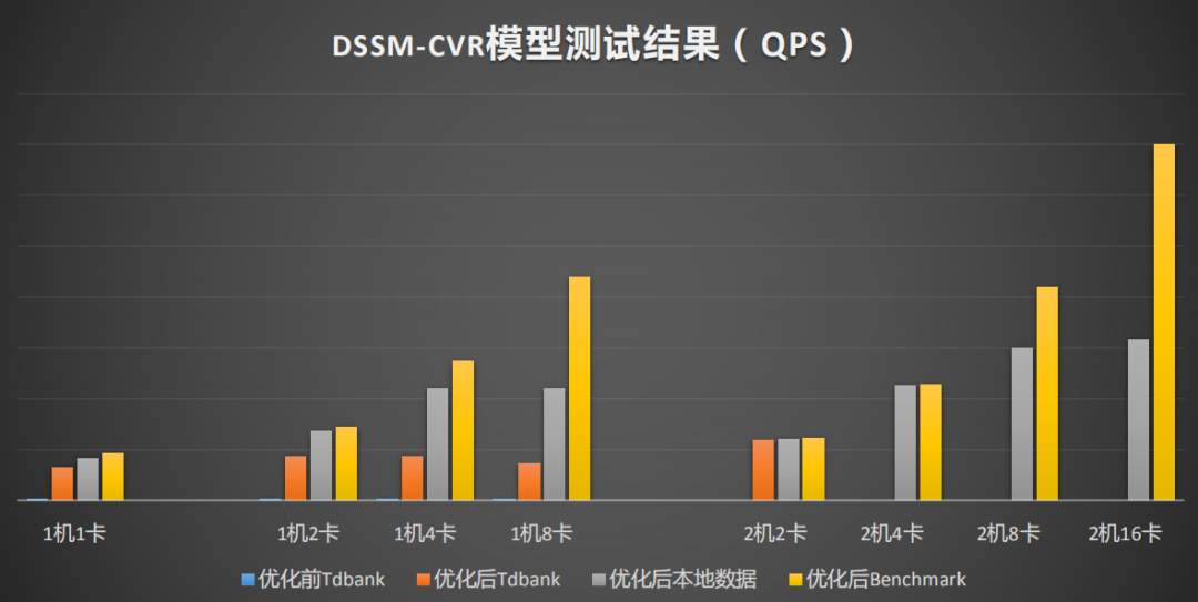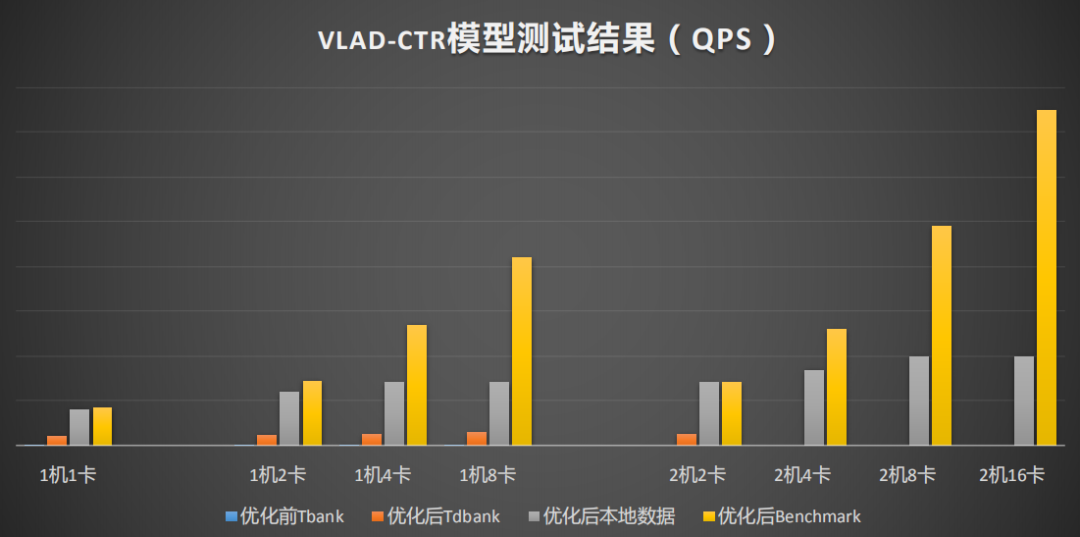通过在模型层面和数据层面的优化,以及Angel平台应用到整个控制流程中,DSSM的单卡性能有33倍的提升,VLAD有22倍的提升,YOLO有2.5倍的提升如图17所示。图18、19、20是详细测评结果,它们有三种类型的测试模式,分别是训练数据通过TDbank(腾讯自研的MQ系统)线上拉取(时延包括网络传输、数据packing等);本地数据读取,训练数据预先存放本地磁盘(时延包括磁盘IO,数据映射预处理);Benchmark模式训练数据放内存(时延仅包括数据映射预处理)。从图18中看到Benchmark不考虑数据读取前的延时基本能把整个系统计的算能力跑满这是一个准线性地提升。考虑到实际的数据是从MQ中读取,在1卡中提升不大TPS为3000多,2卡QPS为4000多,两机两卡TPS达到6000多,所以随着多机越多,训练性能达到线性的提升, VLAD-CTR模型的测试具有相同的结果。YOLO V3优化后1机1卡有2.5倍的性能提升,1机8卡有7.2倍的提升。