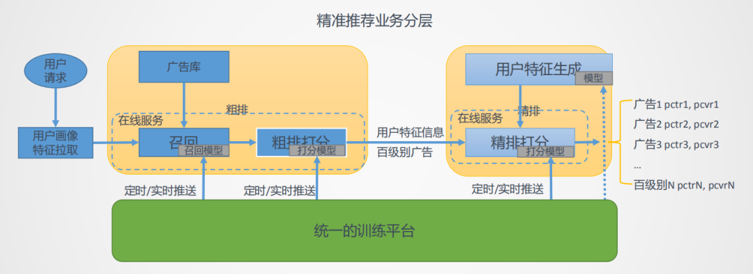 腾讯的推荐广告推荐系统业务分层如图9所示,用户发送一个请求后会去拉取用户地画像特征,之后会对广告库的广告进行一个初步地排序和打分,打分之后会提取用户地特征信息,同时将广告库的ID数量降为百级别,在这个百级范围内会有一个精细的排序,完成后将广告推送给用户。整个推荐系统面临着下面的几大挑战,首先是数据来源多样化,数据既有线上数据也有历史落盘数据。其次是数据的格式多元化,包括用户信息、Item信息、点击率和图像等数据的多元格式。然后是增量数据多,用户请求频繁,广告库也在不断更新中。最后是训练任务多元化,整个推荐系统涉及到粗排、精排、图像检测和OCR等任务。为了解决上述问题,我们在精准排序任务上开发了一整套的软件框架"智凌"(基于TensorFlow)来满足训练需求。