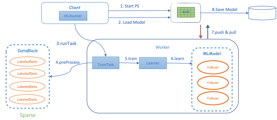 Angel机器学习平台任务提交执行简单,具体步骤如图3所示,进入Cient后,启动一个PS实例,该PS会从Client端加载模型,之后Client会启动多个Work,Work会加载训练数据开始训练和学习,push和pull会进行参数的拉取和更新,训练完成后将模型存入指定的路径。