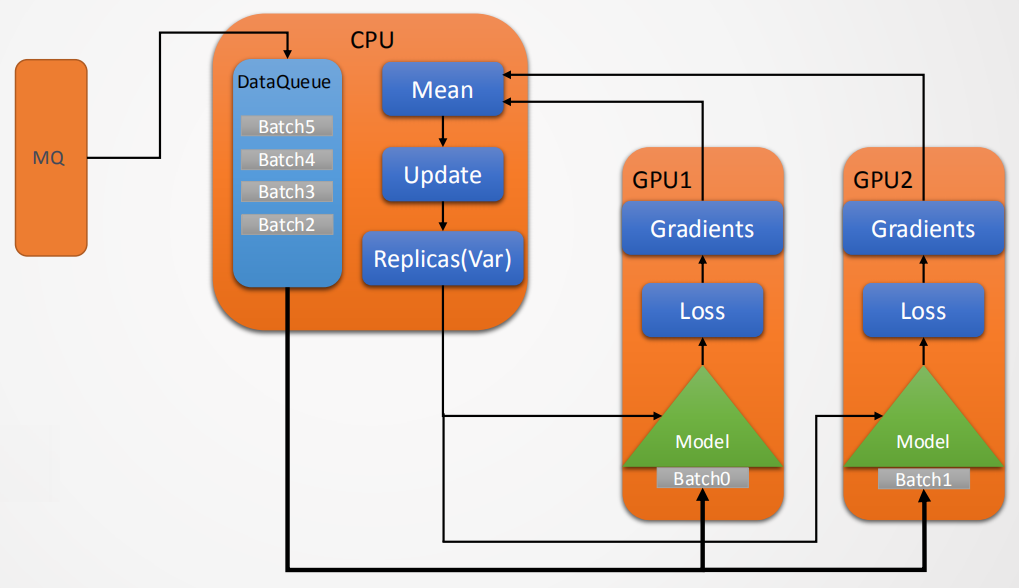"智凌"框架结构如图10所示,该框架最底层C++ core封装了MQ receiver和深度学习框架的一些OP类,最典型的是TensorFlow的dataset类,通过封装tensorflow的dataset类来提供从MQ获取数据的能力。数据抽象和处理在C++和Python上完成。然后是深度学习的framework(tensorflow)层提供各种深度学习的库。最后是具体的应用模型如DSSM、VLAD和一些图像算法的模型等。"智凌"软件框架具有算法封装完整、开发新模型较快、数据和算法隔离解耦较好、预处理逻辑方便修改和更新及兼容性好等优点,但同时对于Tensorflow框架侵入性修改多、单机多卡性能差、多机分布式不支持、算法和OP层面优化不够完全等缺点。图11是"智凌"在基础数据上的训练流程图,从图中看到从消息中间件中读取数据到本地的DataQueue中,DataQueue给每个在GPU节点上的模型分发Batch数据然后进行训练,训练完成后读取到CPU进行梯度融合和备份然后分发给各个GPU进行再训练,这种设计是面向单机结构的设计,CPU去实现梯度的融合和优化器的功能,CPU资源消耗大,这种设计很不合理,针对这种情况我们做了很多的优化后面会向大家介绍。