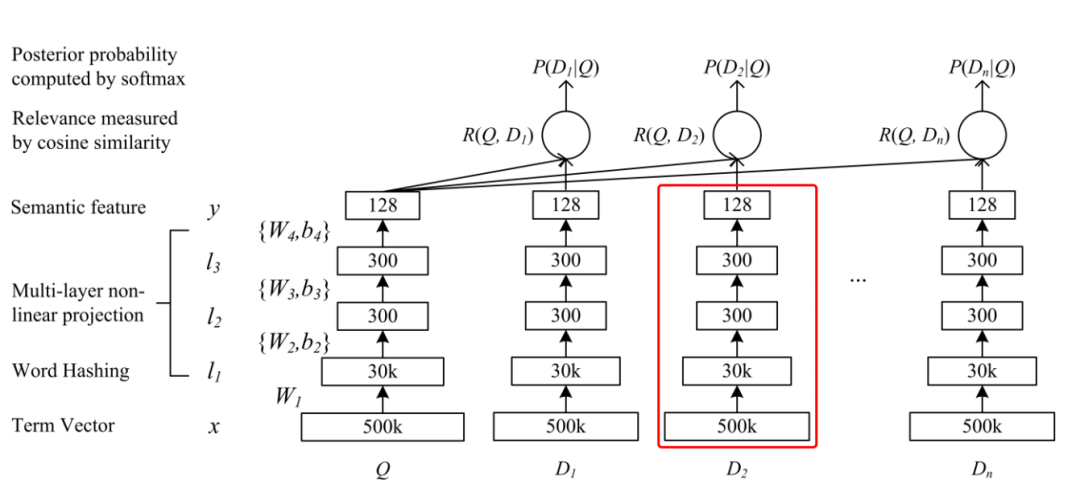 DSSM增强语义模型如图12,在这里我们用该模型来计算用户和推荐ID之间的相关性并在此基础上计算用户对给定推荐ID的点击率,相关性和点击率计算公式分别是: