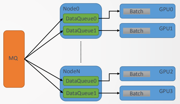 前面的介绍中我们知道"智凌"软件框架是单管道数据流,现在我们将其优化为多管道如图15所示,即通过多机多数据流来解决单机IO瓶颈问题。原来的单管道数据中会有DataQueue,如果数据流很大会对IO造成很大的压力,优化为多对管道后为每一个训练进程GPU定义了一个DataQueue,通过这种分布式方法来有效解决IO瓶颈问题。这种情况下的管理工作是通过Angel PS(AllReduce版本)进程控制器来进行管理的。