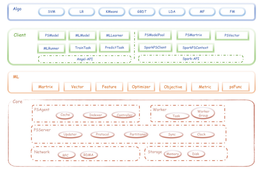 Angel机器学习平台在代码结构设计上做了很多的抽象,这样的设计方式可扩展性强,整个结构主要分为四层如图4所示。核心层(Angel-Core)是基础层,主要包括PSAgent、PSServer、Work、Network和Storage等。机器学习层(Angel-ML)提供基础数据类型和方法,同时用户可根据PsFunc定义自己的方法把私有模型接入。接口层(Angel-Client)可插拔式扩展,支持多种用途比如接入TensorFlow和pyTorch等。算法层(Angel-MLLib)提供了封装好的算法如GBDT、SVM等。
