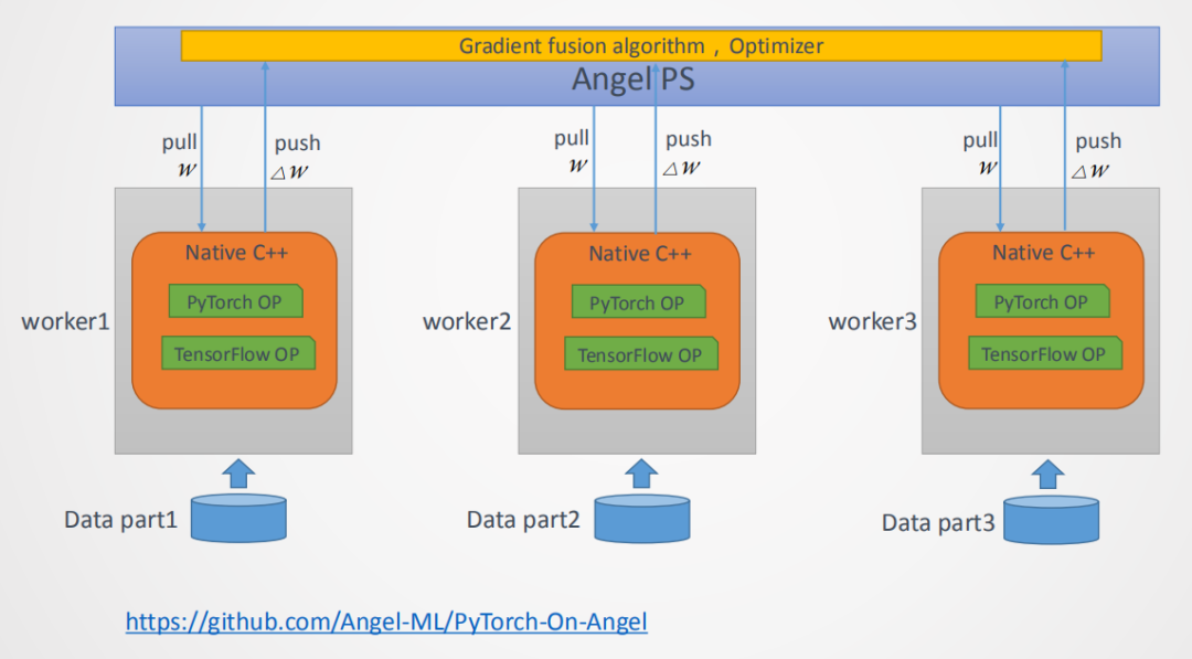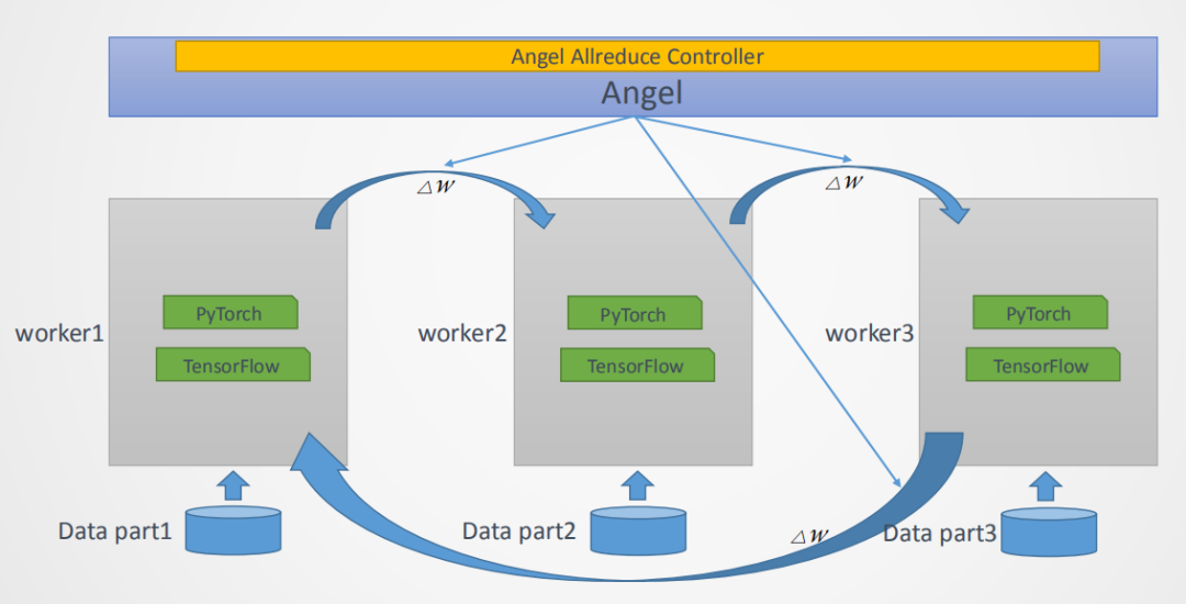 深度学习常用的分布式计算范式有两种,分别是MPI ( 基于消息模型的通信模式 ) 和Parameter Server,如图5所示。这两种范式均在Angel平台上有实现,对于Parameter Server范式的实现如图6所示,Angel Work可通过Native C++的API接口接入常用的深度学习的OP如PyTorch或者Tensorflow等,在训练的起始端Angel PS会把模型Push到每个Worker上,Worker会加载到对应的OP上进行训练,每次训练完成后会将梯度信息回传到PS上进行融合,以及应用优化器得到更新的参数,完成后又会分发到每个Worker上,重复上述过程直到训练结束,最终将模型保存到指定路径。这种方案Angel PS提供了一个梯度PS的控制器,来接入多个分布式的Worker,每个Worker上可以运行一些通用的深度学习框架例,这种方案PyTorch版本的工作我们已经完成,并已经开源了(PyTorch on Angel)。另外一种是MPI AllReduce范式如图7所示,这种范式梯度信息是通过AllReduce方法进行融合的,在这种范式的实现上,Angel PS是一个进程控制器,会在每个Work上拉起一个进程,这个进程可以是PyTorch或者是Tensorflow等进程,这种范式对用户侵入少,用户开发的算法不需要太多的修改即可接入到Angel平台进行训练。