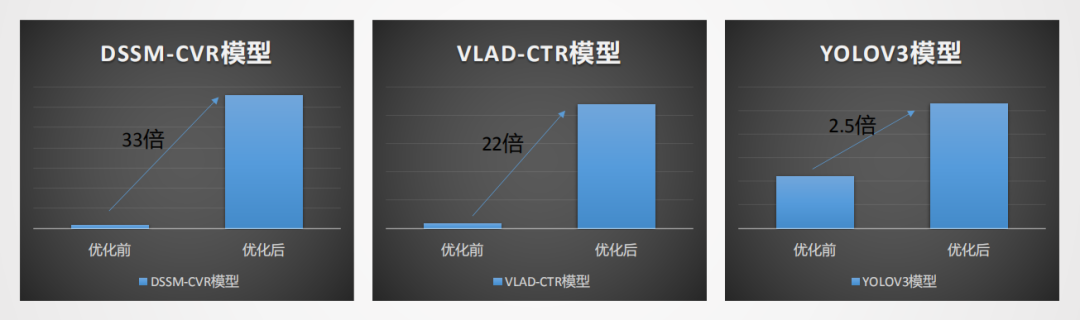 Fig18 优化后的DSSM-CVR模型性能提升结果Fig19 优化后的VLAD-CTR模型性能提升结果Fig20 优化后的YOLO V3模型性能提升结果今天主要和大家分享了三部分的内容,第一部分内容是介绍了腾讯的Angel机器学习平台和其在深度学习方向上的拓展和应用,第二部分的内容是介绍了腾讯广告推荐系统的特点和常用模型,最后一部分的内容介绍了Angel深度学习在腾讯广告推荐系统中的应用,模型训练和优化,以及取得的效果。